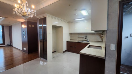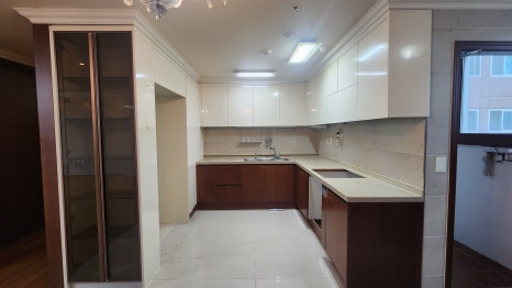ㄱ자 싱크대 안쪽에는 수납장과 3도어 키친핏