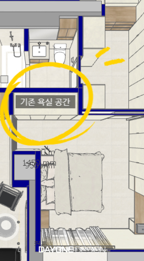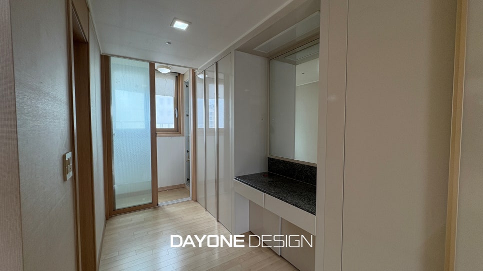 메인룸: 욕실 축소 + 붙박이장 + 워크 스페이스
