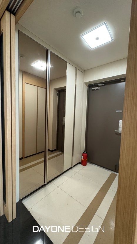 현관은 내추럴 오크 마감으로 따뜻한 첫인상을 주었습니다